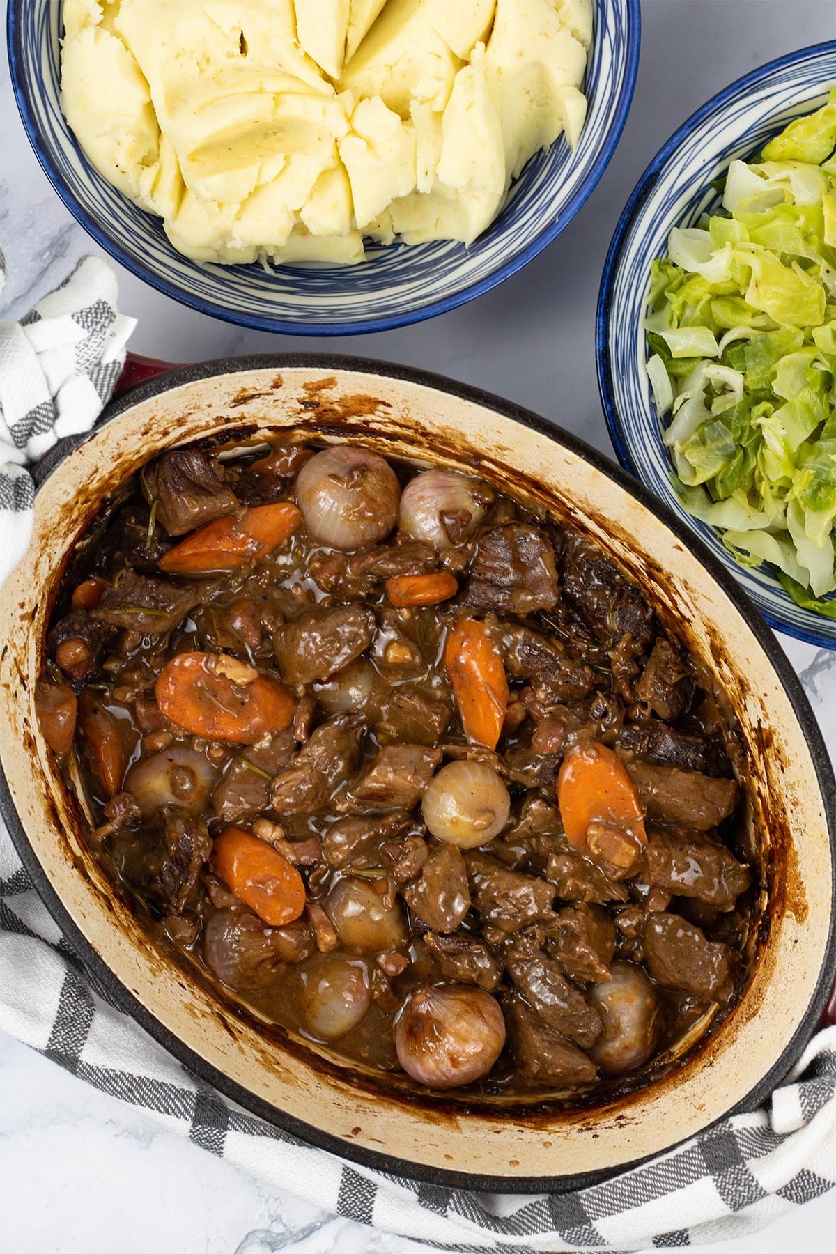 - Preheat the oven to 170C/150C fan/gas 3. Heat the 1 tbsp of the olive oil in a large non-stick frying pan or sauté pan over a high heat. Season the beef really well with salt and freshly ground black pepper, then add about a quarter of it to the pan and brown it well on all sides. Tip the browned meat into a large casserole dish. If there are lots of brown and crusty bits in the pan, tip off the excess oil between batches, let it cool down a little and add a glug of wine. Use a wooden spoon to scrape off the brown bits and tip them into the pan with the meat. Repeat with the rest of the meat, adding more oil if you need to.