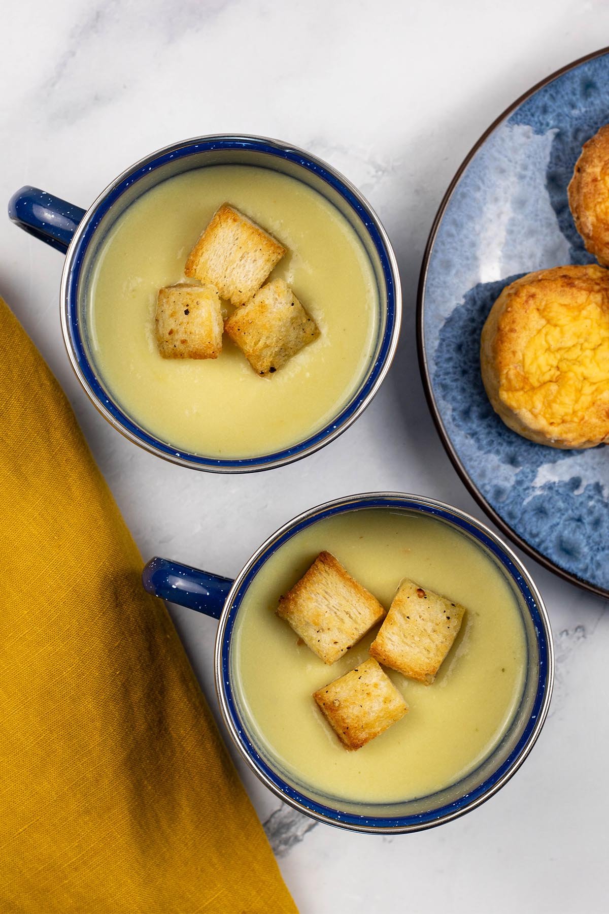 - When the soup is ready, put it in a food processor or use a stick blender in the pan and blend until you get a smooth creamy, thick soup. Add the grated cheese and stir until it's melted. Top up with more milk to thin a little if serving in mugs, and top with the croutons (if using).