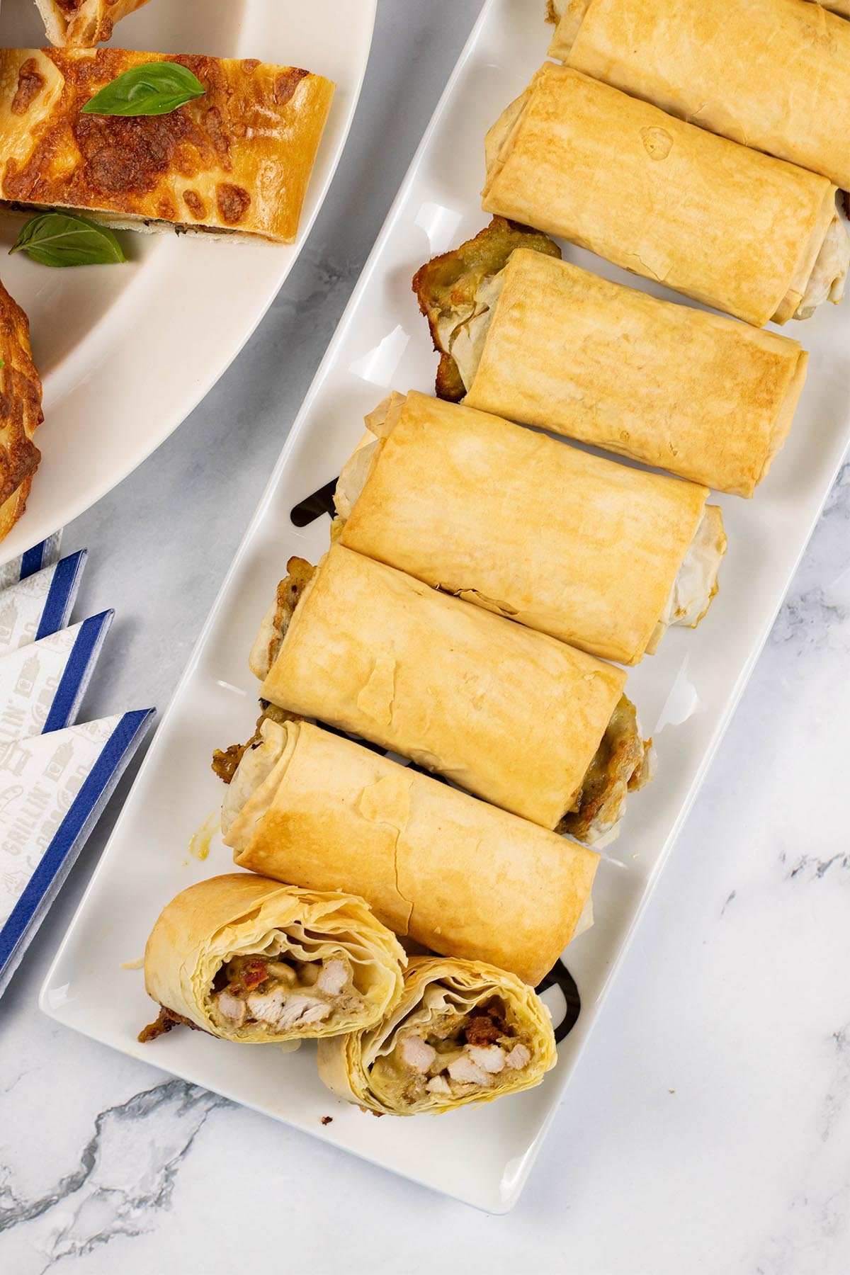 - Brush 1 filo sheet with butter. Lay a second sheet on top, brush with butter, then top with a third filo sheet. (Keep the remaining filo sheets covered with a damp tea towel while you work.) Halve the filo stack lengthways. Place 2 tbsps of the chicken mixture along the shorter edge. Fold in the sides, then roll up. Before you get to the end, brush with a little butter to seal the seam. Repeat with the remaining filo pastry and chicken mixture to make 8 parcels.