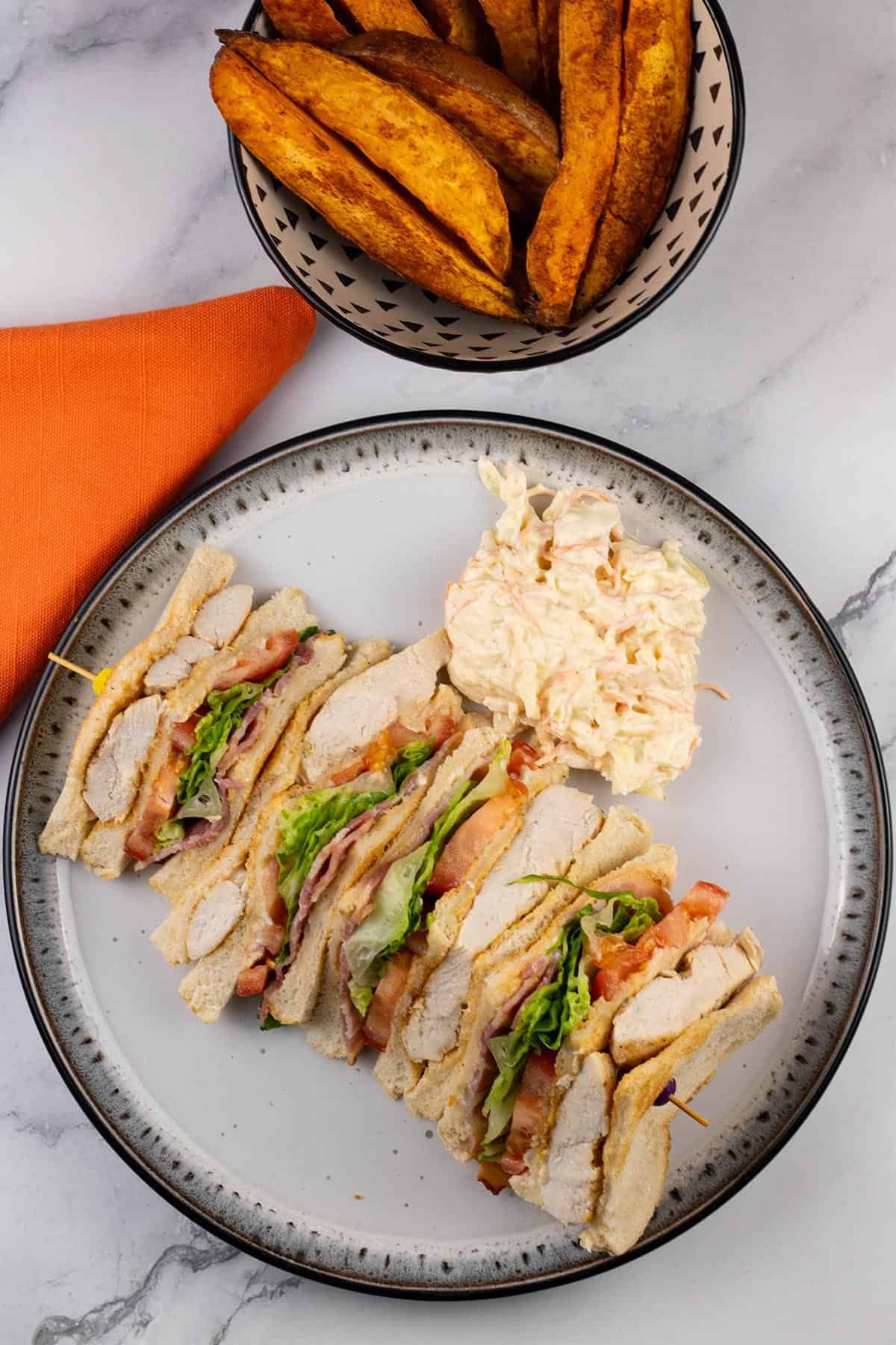 Traditionally, it's a three-layered sandwich with cooked chicken or turkey, bacon, lettuce, tomato, and mayo - stacked between toasted bread slices and cut into quarters.
