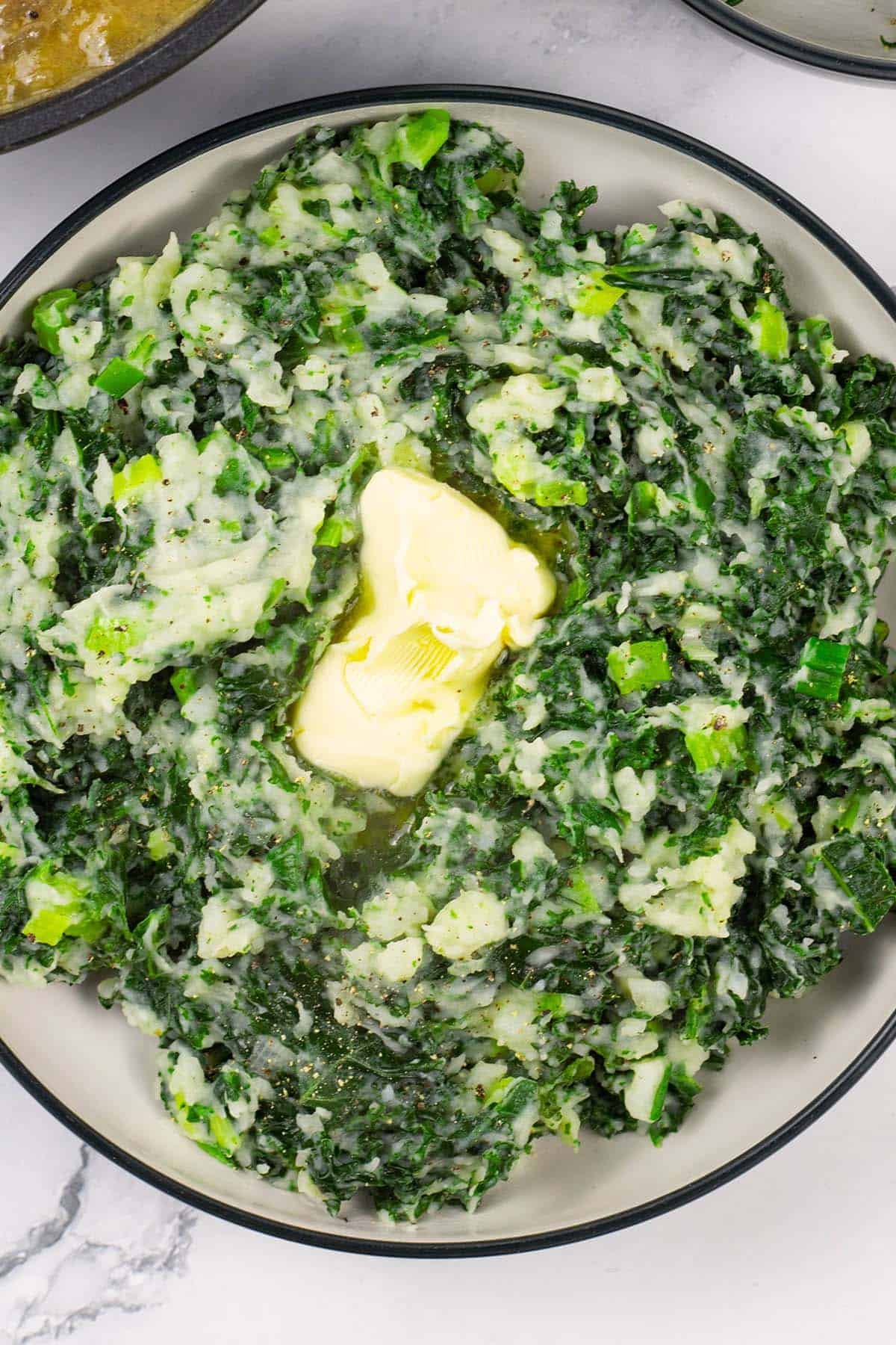 - Add the potato mixture to the kale and stir until well combined. Check the seasoning, adding more, to taste, if needed. Heat through and then transfer to a serving bowl, with the other 25g of butter placed in the middle of the finished dish.