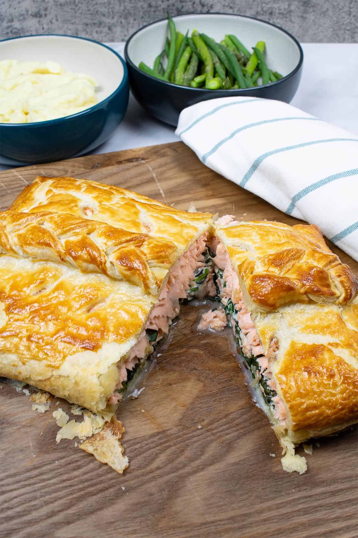 This easy salmon en croute recipe features flaky salmon wrapped in golden puff pastry with a creamy spinach filling. Perfect for a special dinner or entertaining guests!