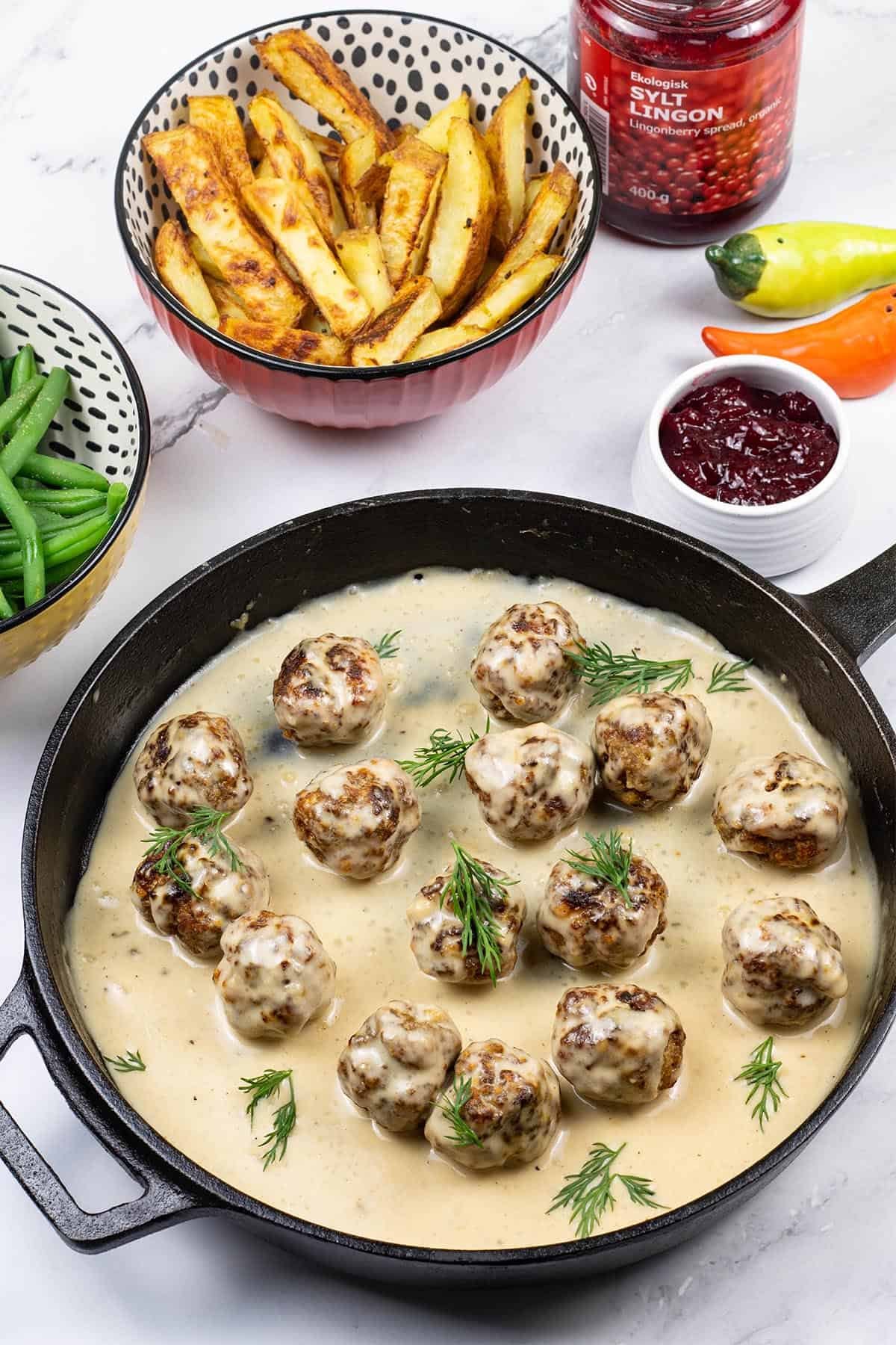 - Melt the butter over a medium heat in the same frying pan you fried the meatballs in (no need to wash it first), and stir in the flour. Sizzle for a minute or 2, then slowly add the stock, whisking to make a smooth sauce. Bubble for 2 to 3 minutes to allow the gravy to thicken. Turn off the heat then add the cream and Worcestershire sauce and some seasoning, to taste. Tip the meatballs back into the gravy, scatter with the dill and serve with mashed potatoes or chunky oven chips, if you like, and the berry sauce.